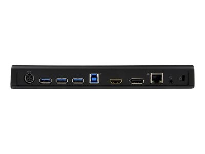 La station d'accueil PC USB 3.0 à double affichage est conforme aux exigences TAA et comprend un hub USB 3.0 à quatre ports, des connecteurs audio pour casque et microphone, un port de charge rapide USB et un port RJ45 GbE avec Wake-on-LAN (WOL).