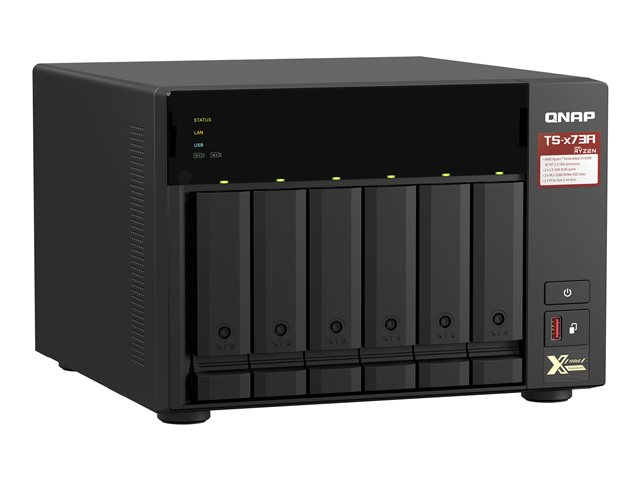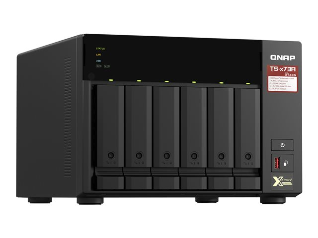 Équipé d'un processeur quad-core AMD Ryzen V1500B de la gamme V1000 qui délivre des performances système élevées avec jusqu'à 4 cores / 8 threads et un Turbo Core à 2,2 GHz. Le TS-673A comprend deux ports 2,5 GbE RJ-45 et deux emplacements PCIe Gen 3 pour que vous puissiez déployer facilement des réseaux 5 GbE / 10 GbE. Deux emplacements SSD M.2 NVMe pour la technologie Qtier et le cache SSD permettent une optimisation constante du stockage. Le TS-673A prend en charge QTS et QuTS hero, ce qui permet aux utilisateurs de changer en toute flexibilité de système d'exploitation en fonction de leurs exigences.