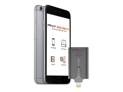 Le DUO-LINK de PNY est une clé USB munie d'un connecteur Apple Lightning intégré qui fonctionne non seulement avec les Mac et PC mais aussi avec les appareils iOS (iPhone, iPad, iPod touch).